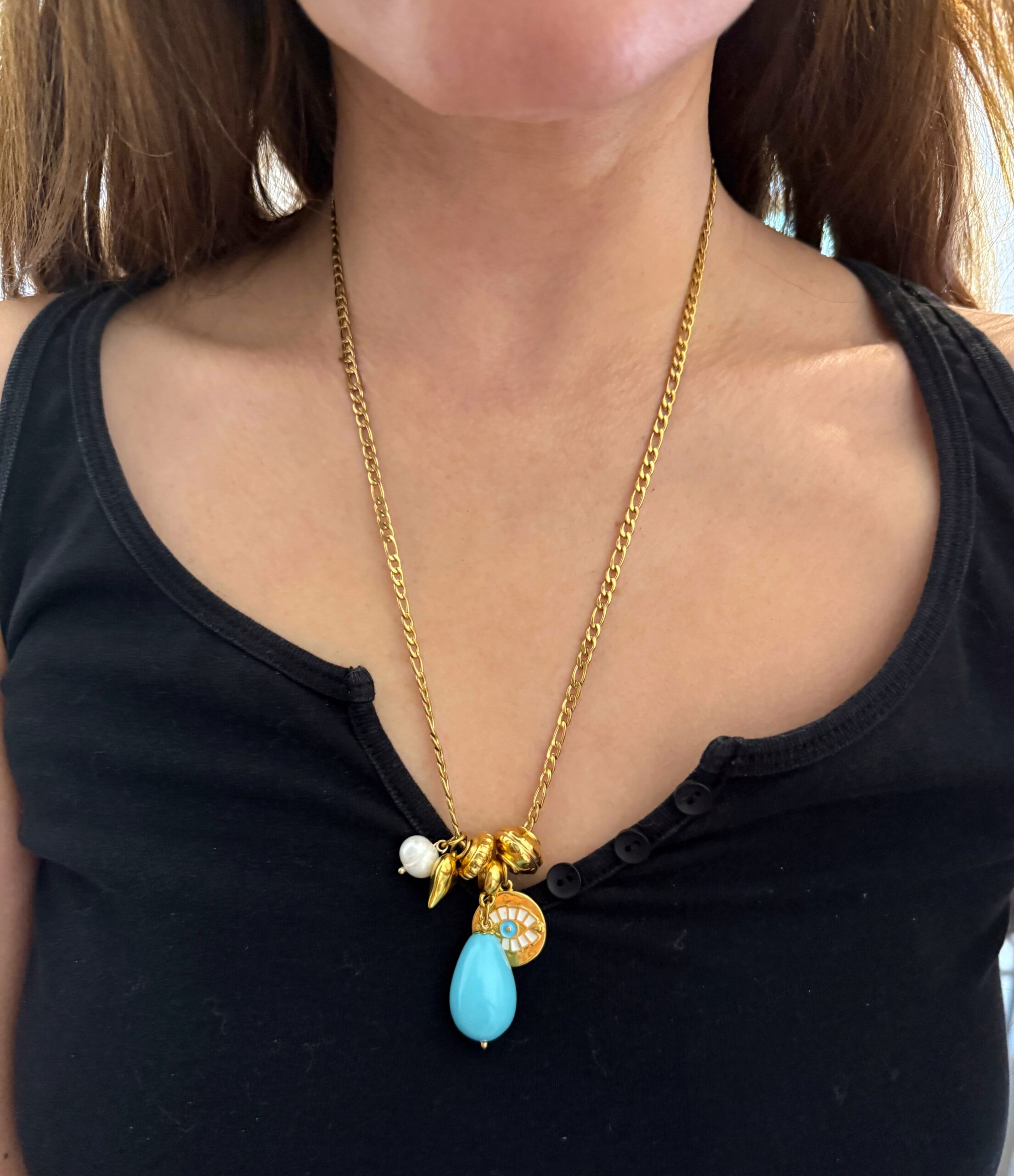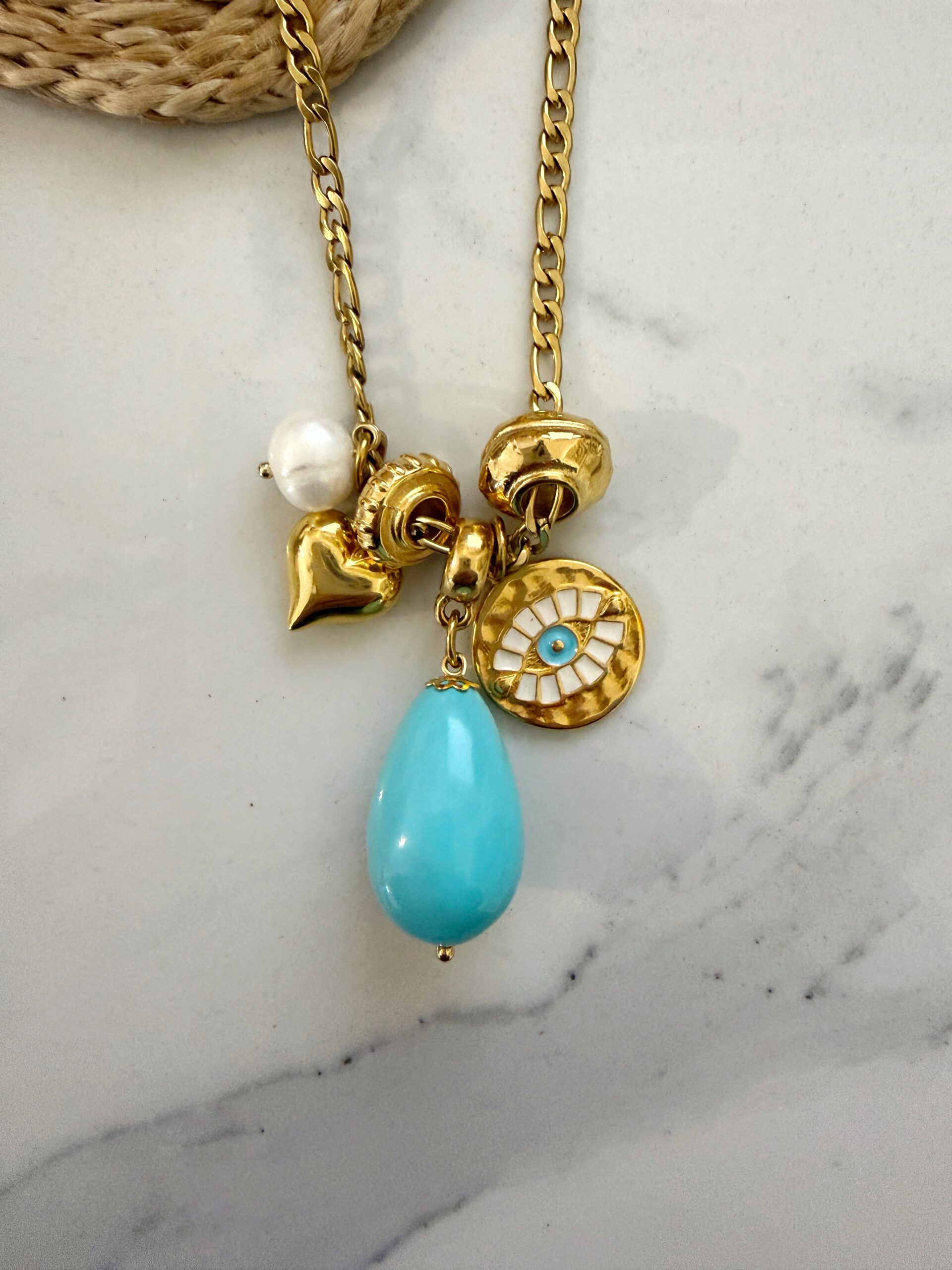 stainless steel classic Figaro chain . Decorated with a beautiful high quality drop charm made of pearl shell dyed turquoise and various charms made of gold plated 24k zamac .