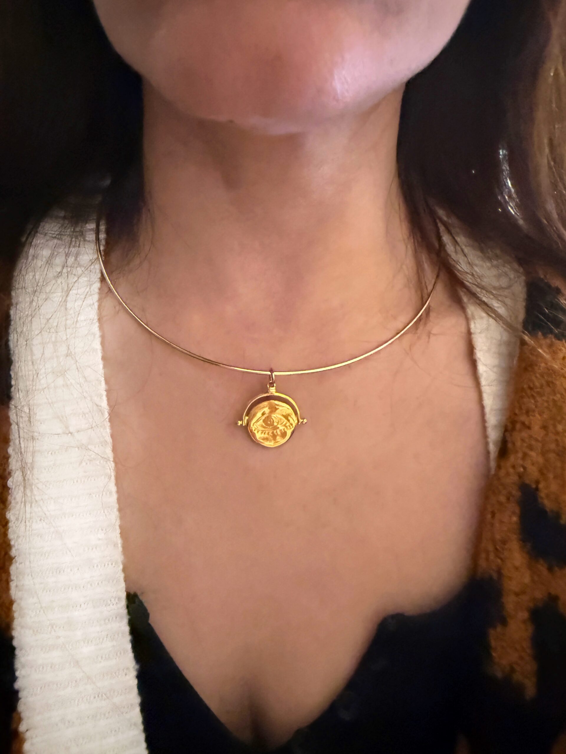 stainless steel bar 2 mm thickness decorated with a beautiful eye pendant made of gold plated 24k zamac .