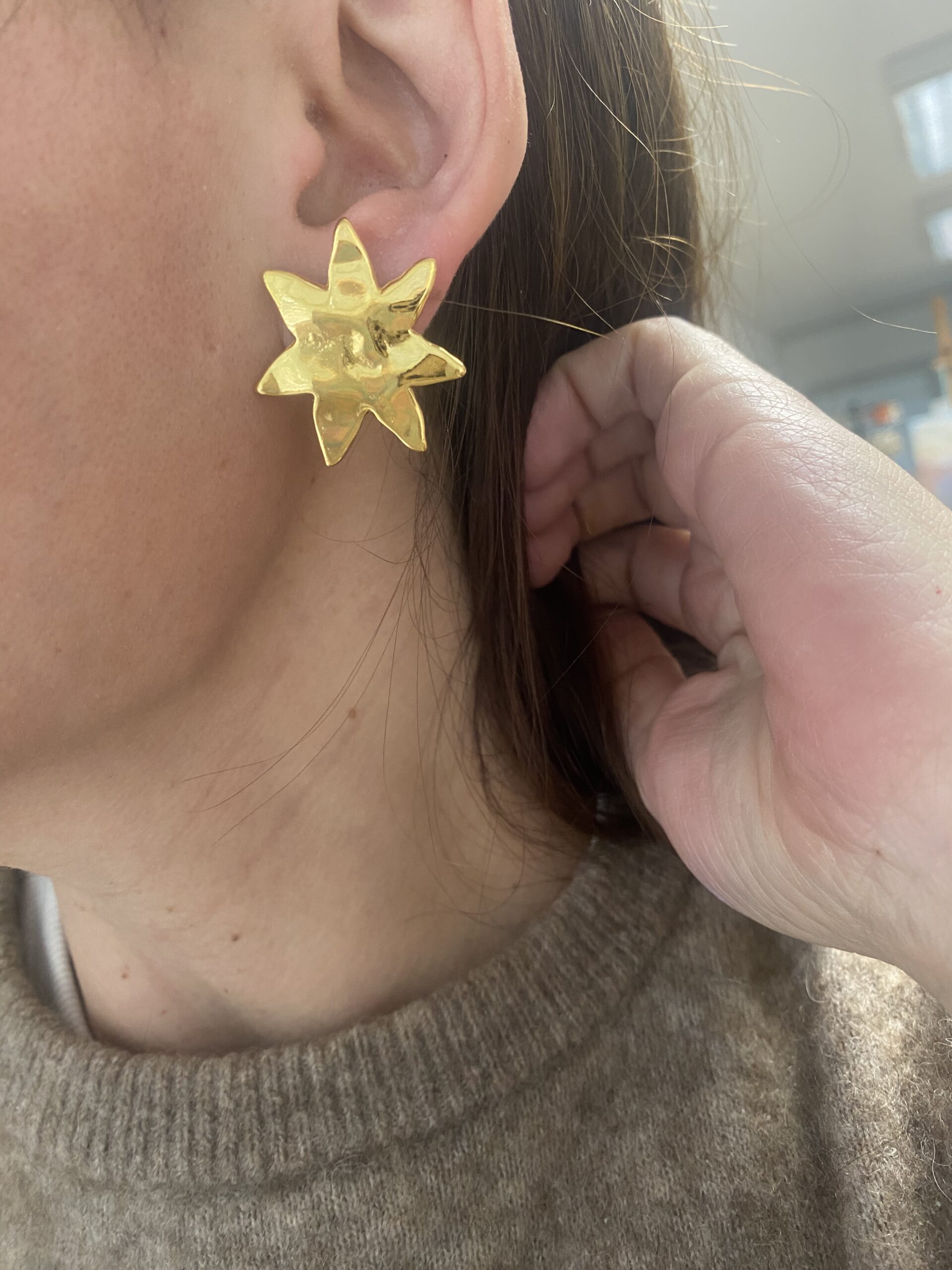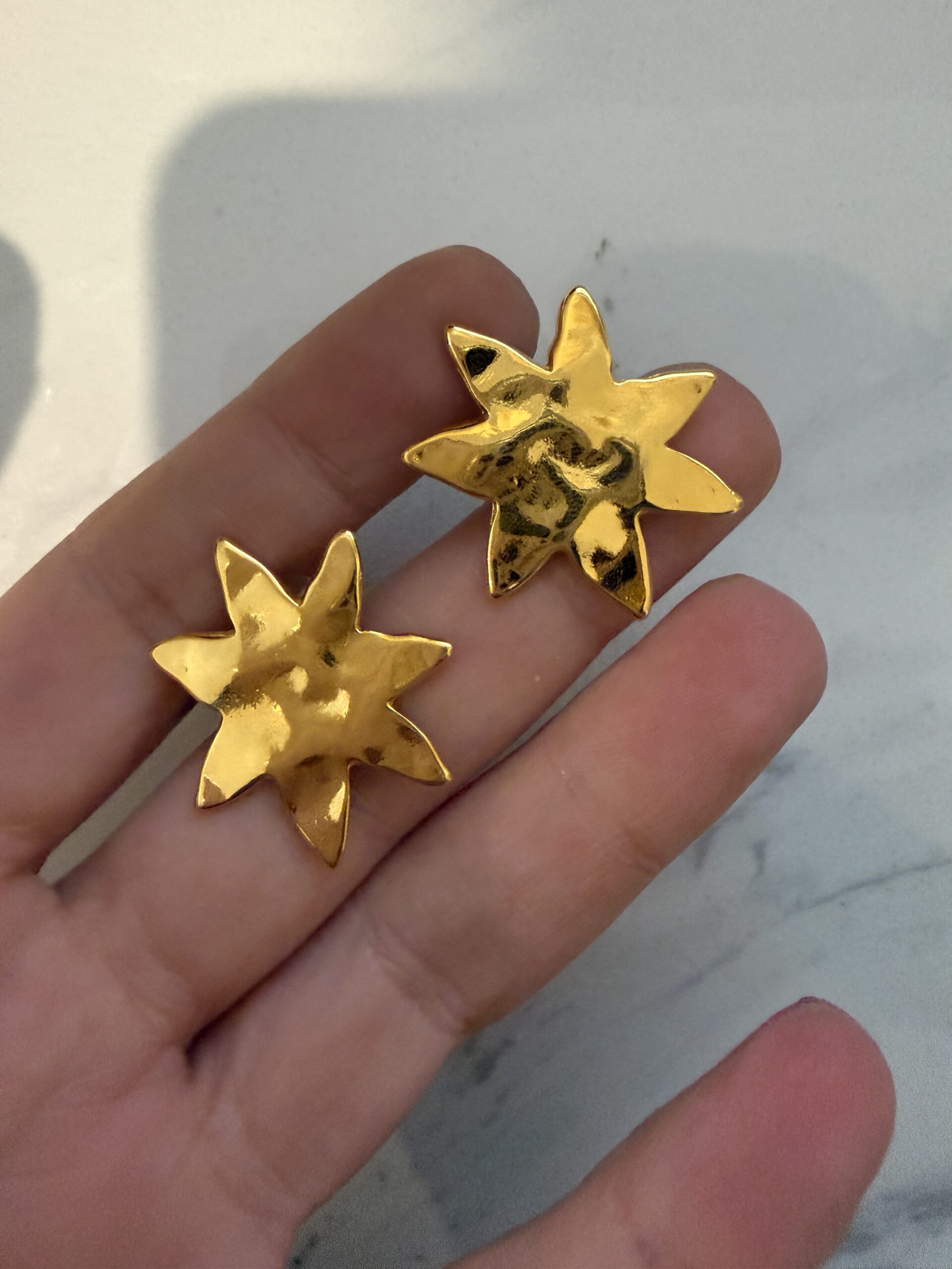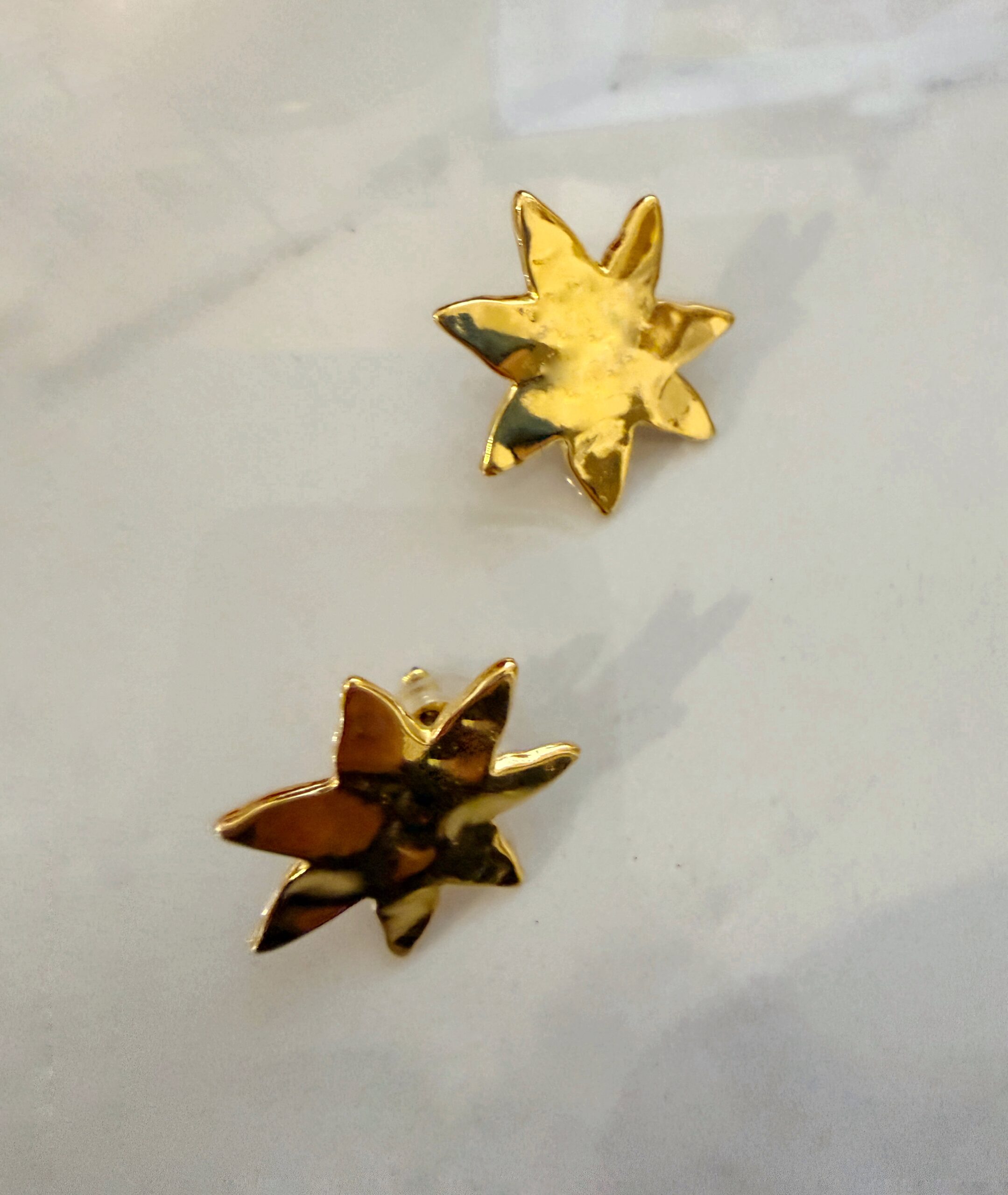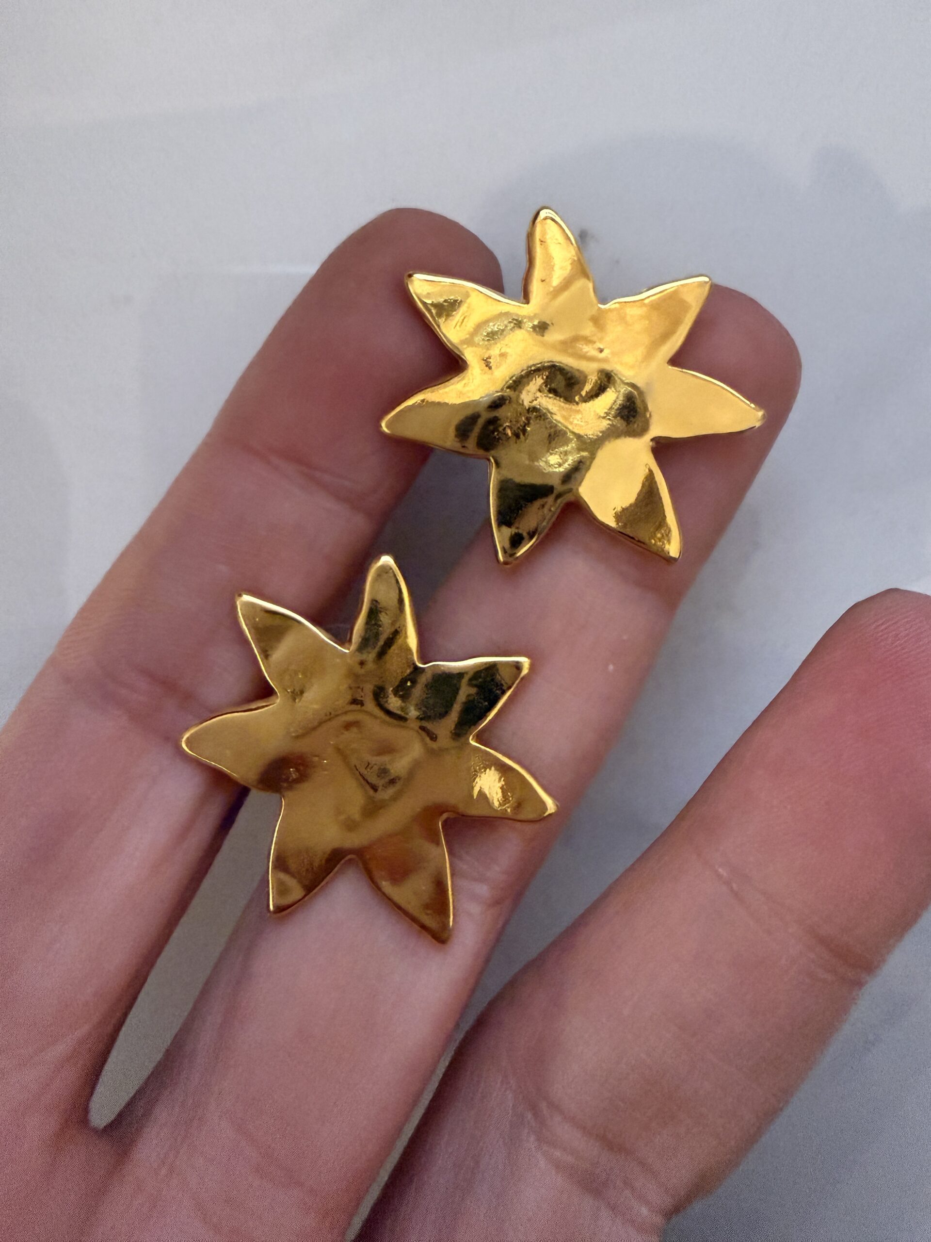 easy to wear everyday earrings with hammered surface  abstract flowers made of gold plated zamac. Pins of the earrings is made of hypoallergenic titanium .