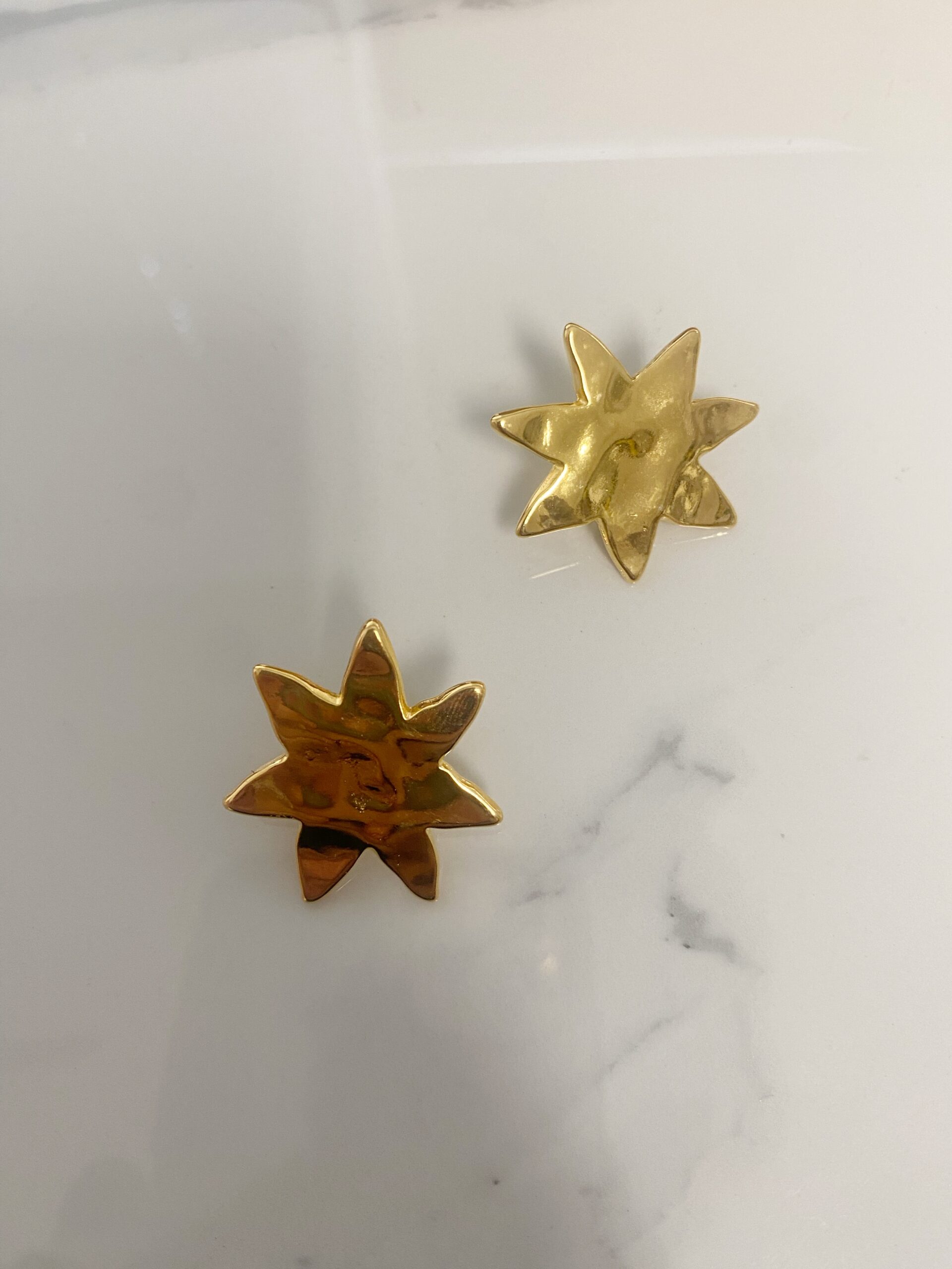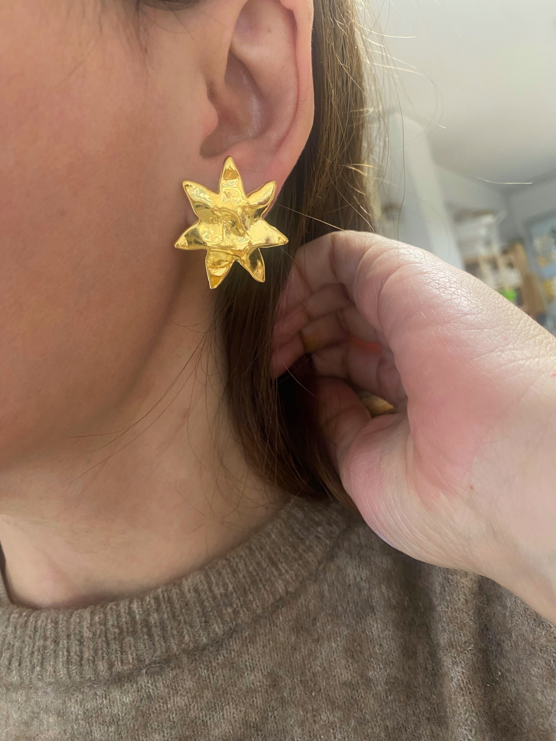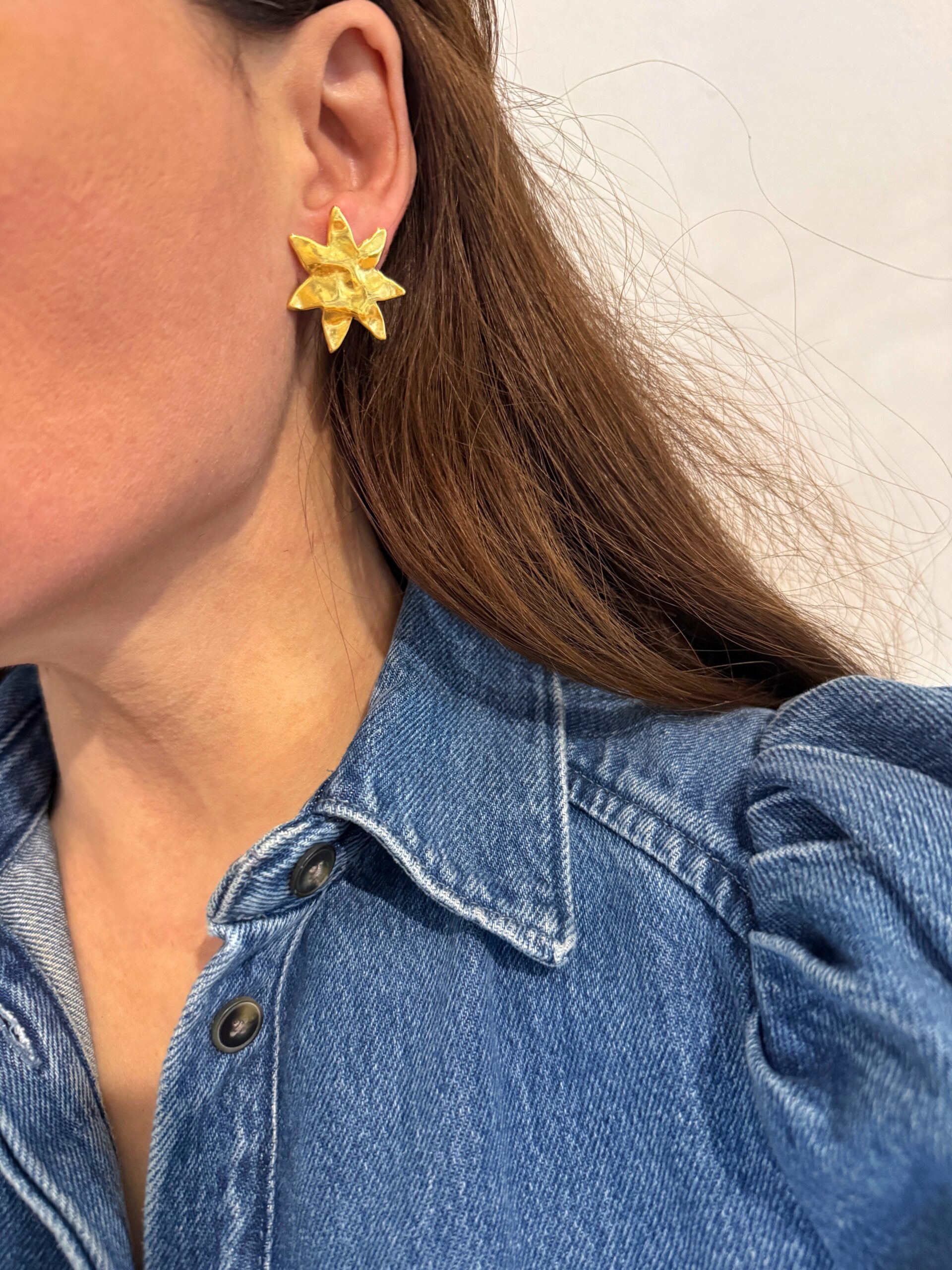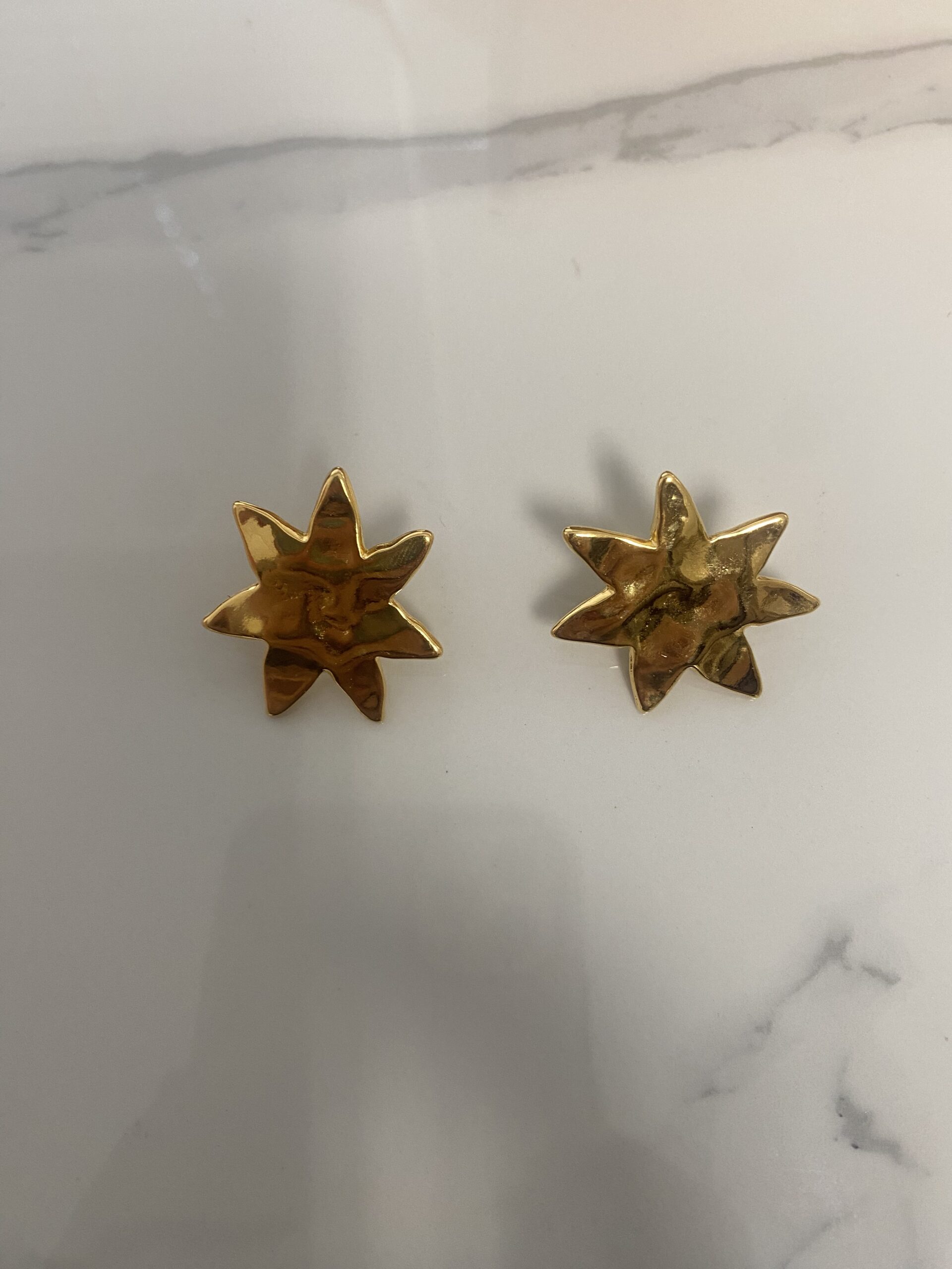 easy to wear everyday earrings with hammered surface  abstract flowers made of gold plated zamac. Pins of the earrings is made of hypoallergenic titanium .