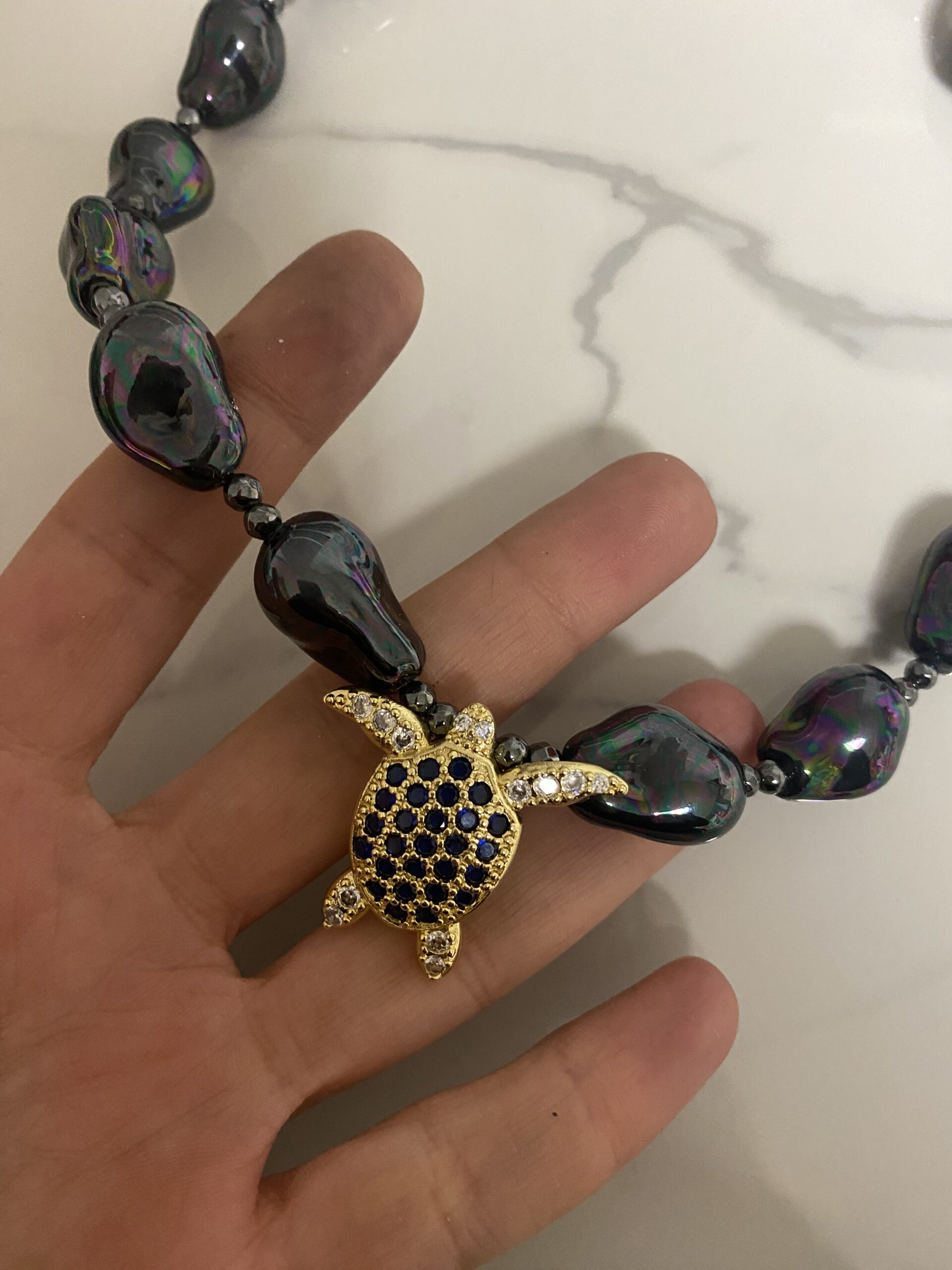 materials : large irregular shape pearl-shell beads ( beads made of the inside part of shells ) small tiny semi precious hematite stones  and stainless steel meta details . Necklace is decorated at the front bottom with a beautiful brass zircon turtle element .