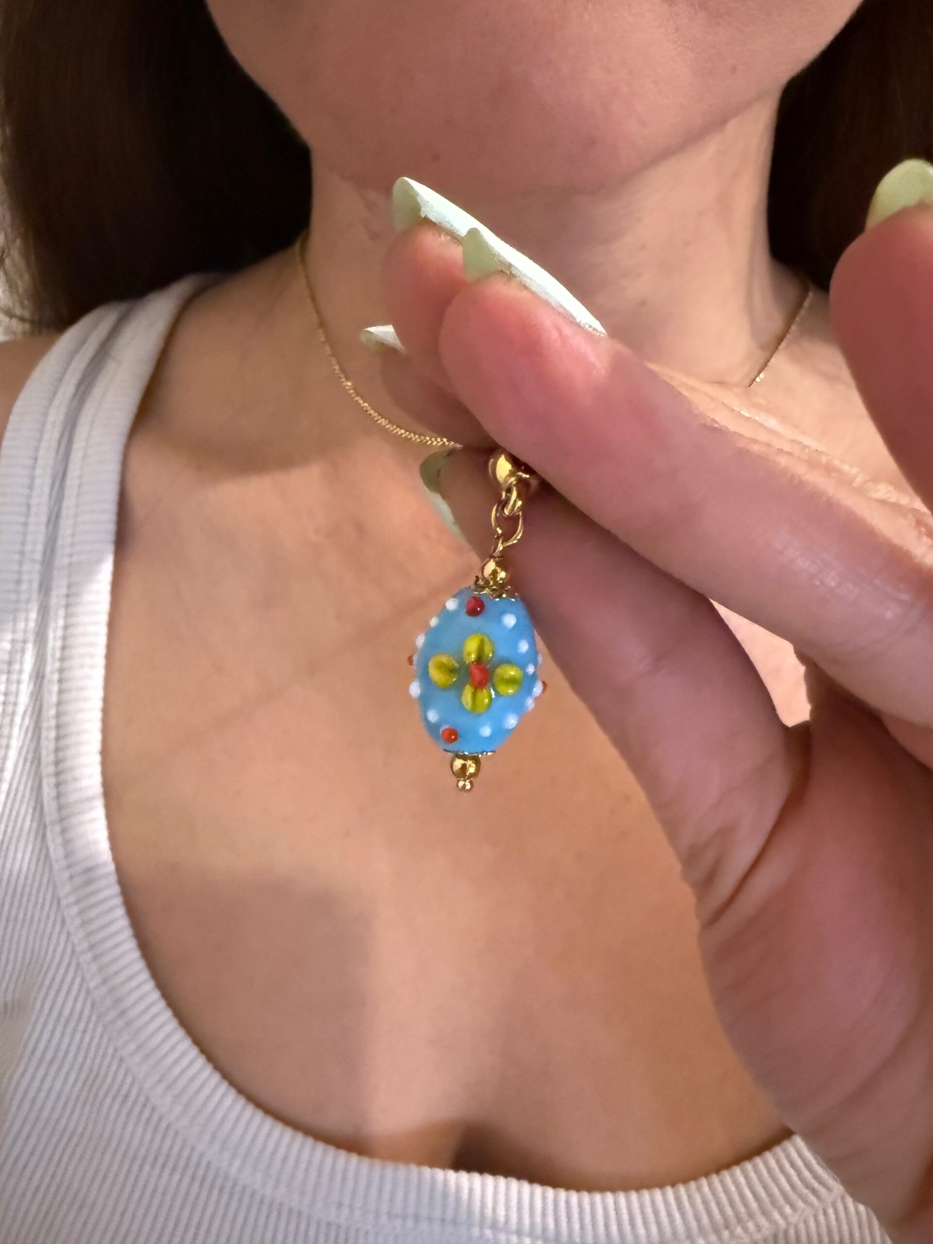 decorated with a beautiful ceramic bead charm .