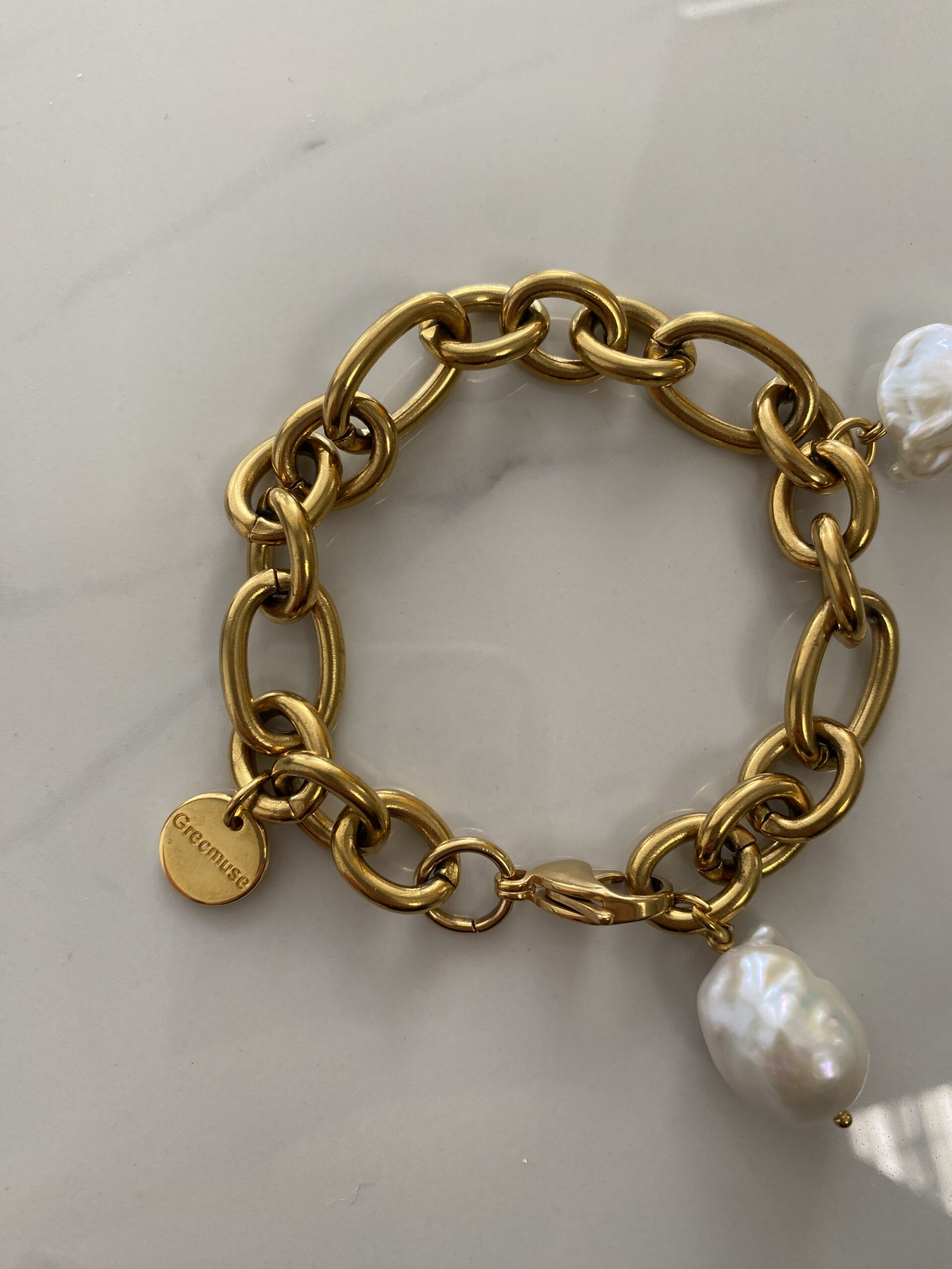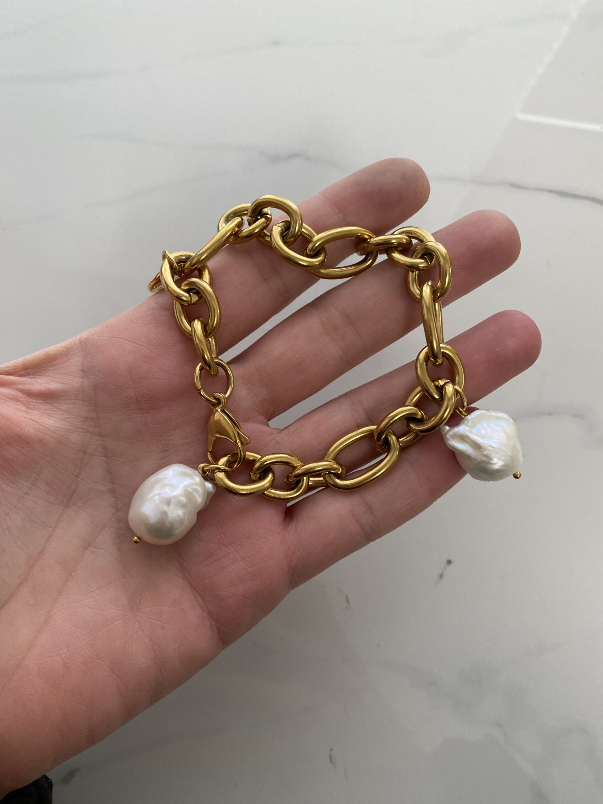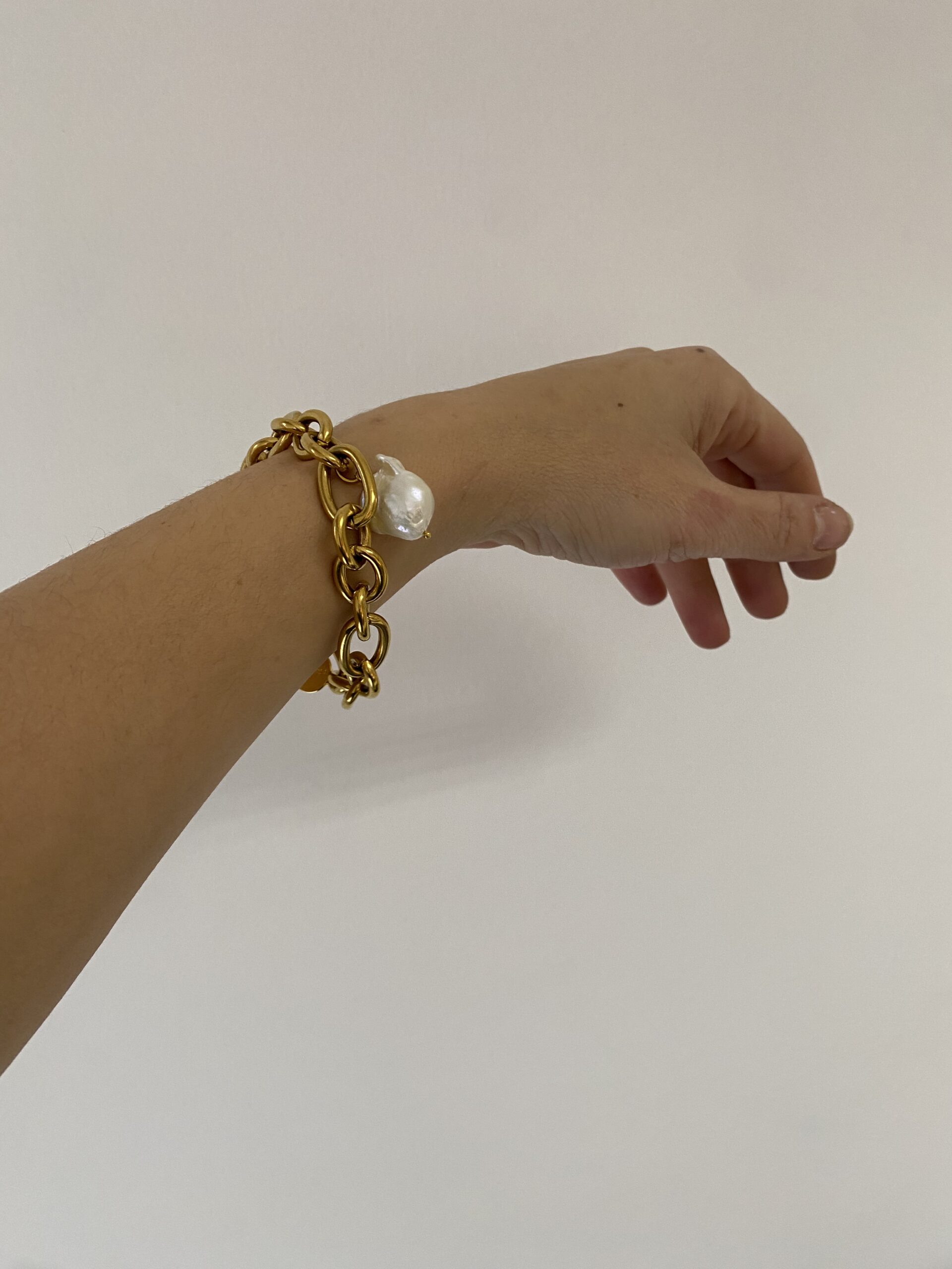 dangling oversized bracelet. made of chunky thick steel chain in gold tone . decorating with two baroque pearls .
