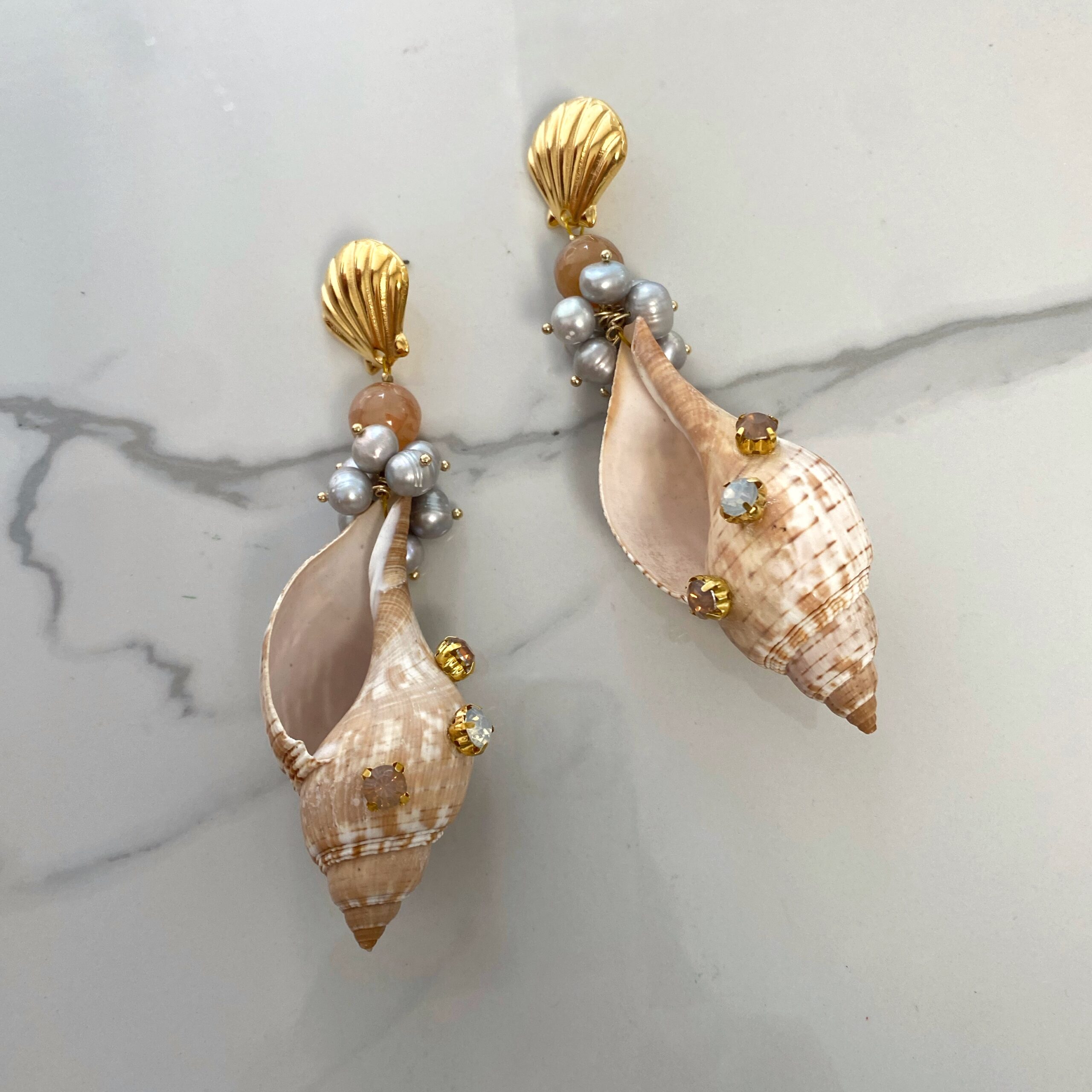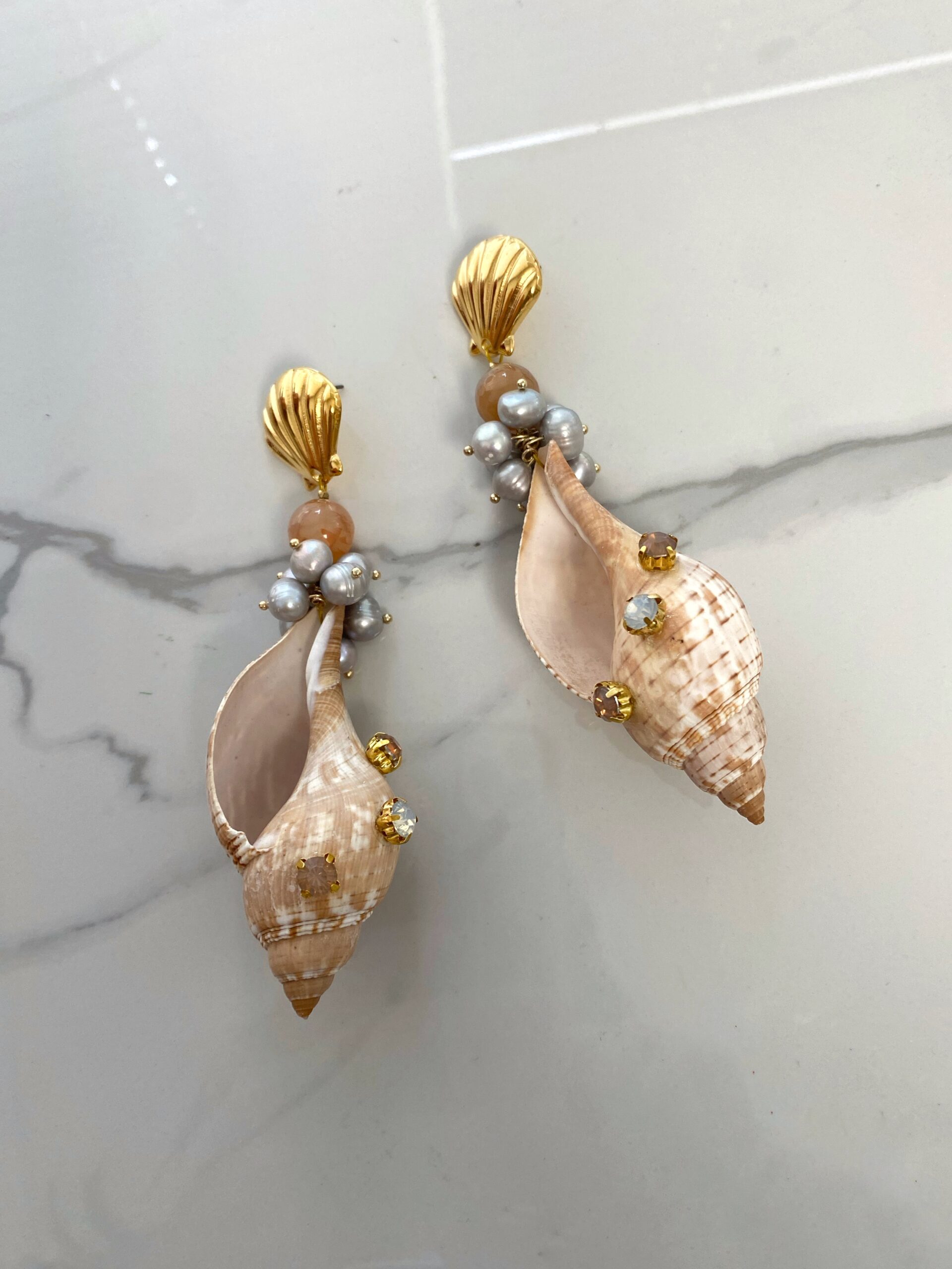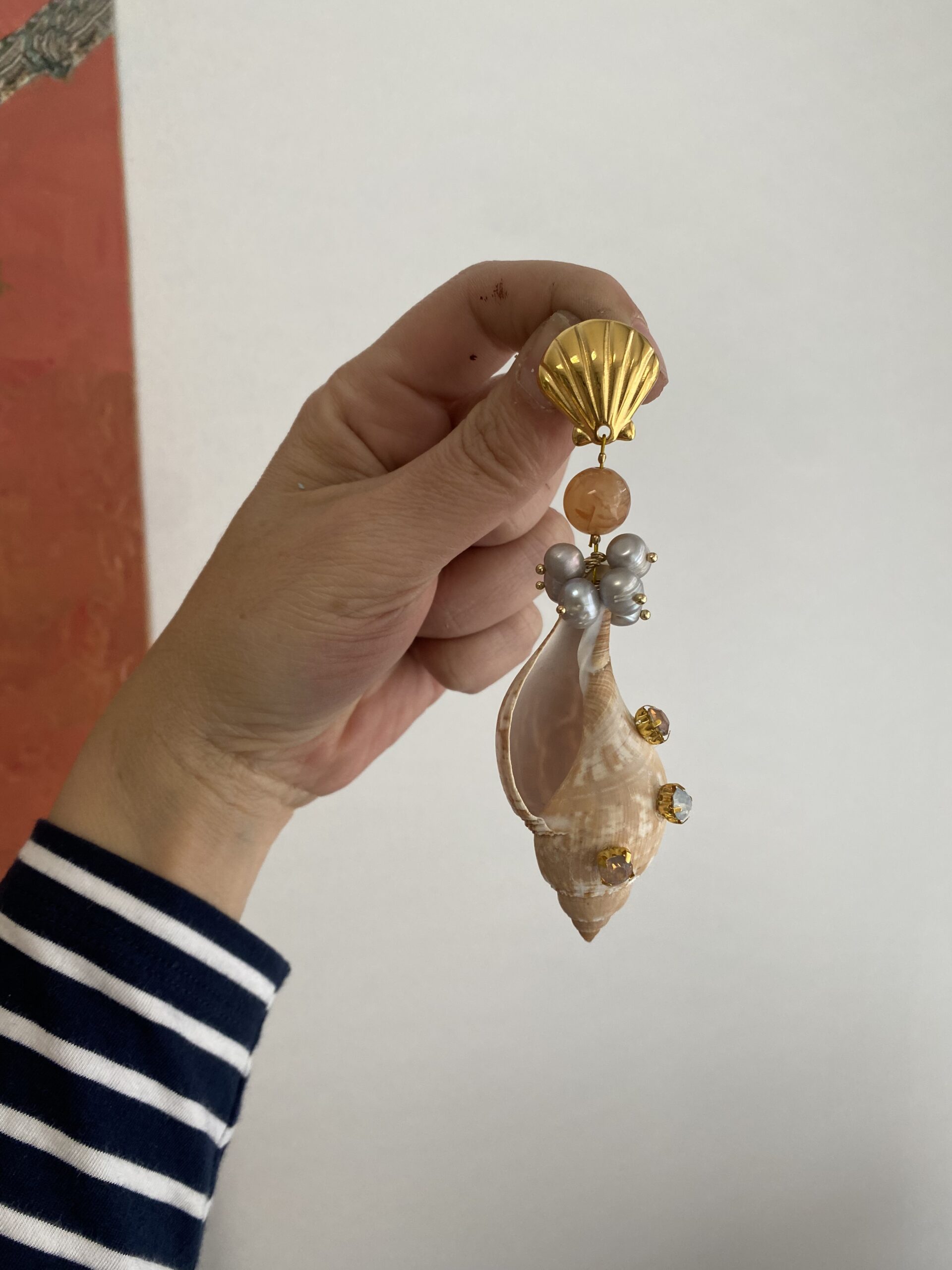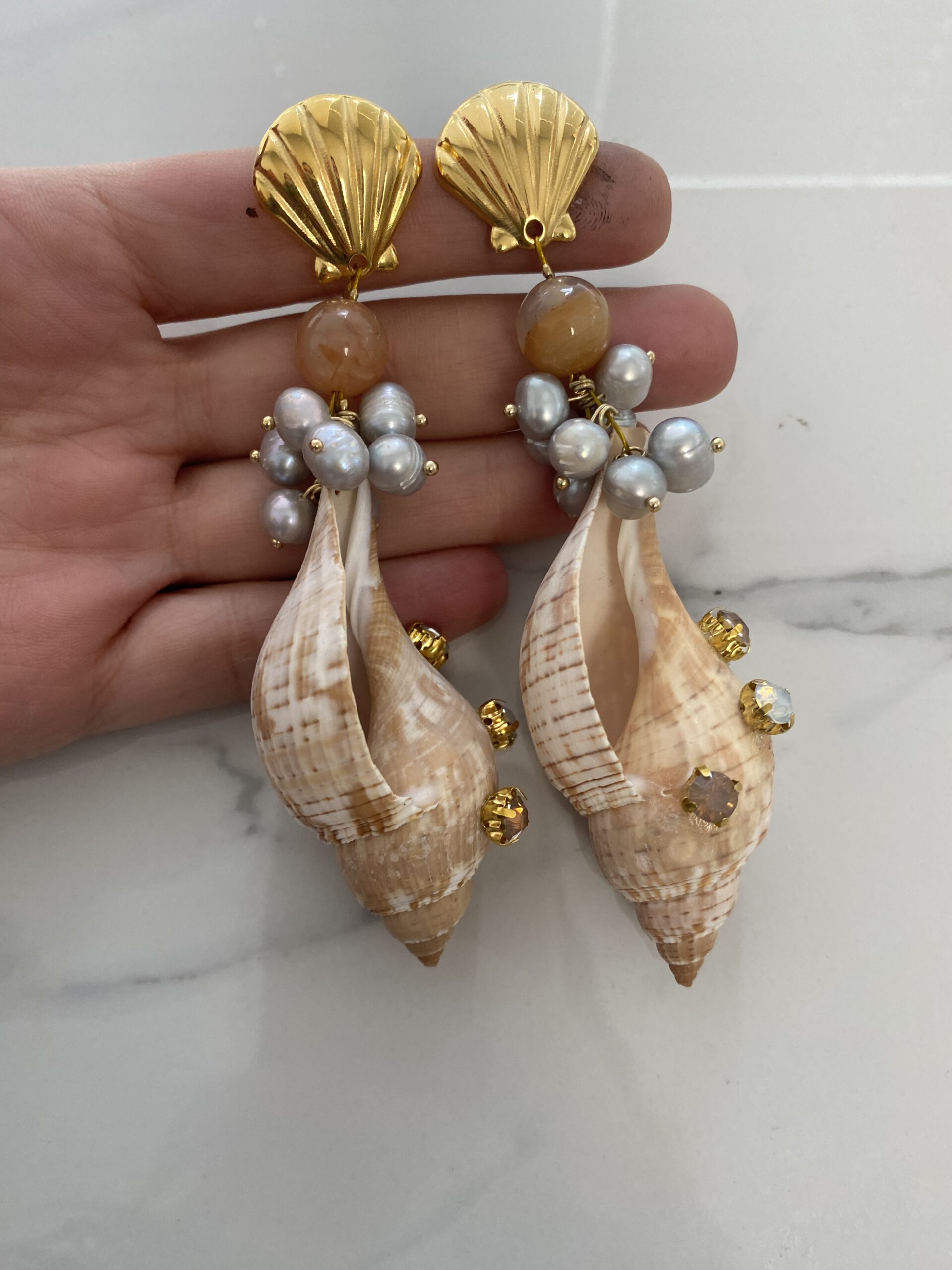 They are decorated with large real shells . Shells have natural colours and they are decorated with tiny crystals . also with grey natural fresh pearls and large agate semi precious stones .