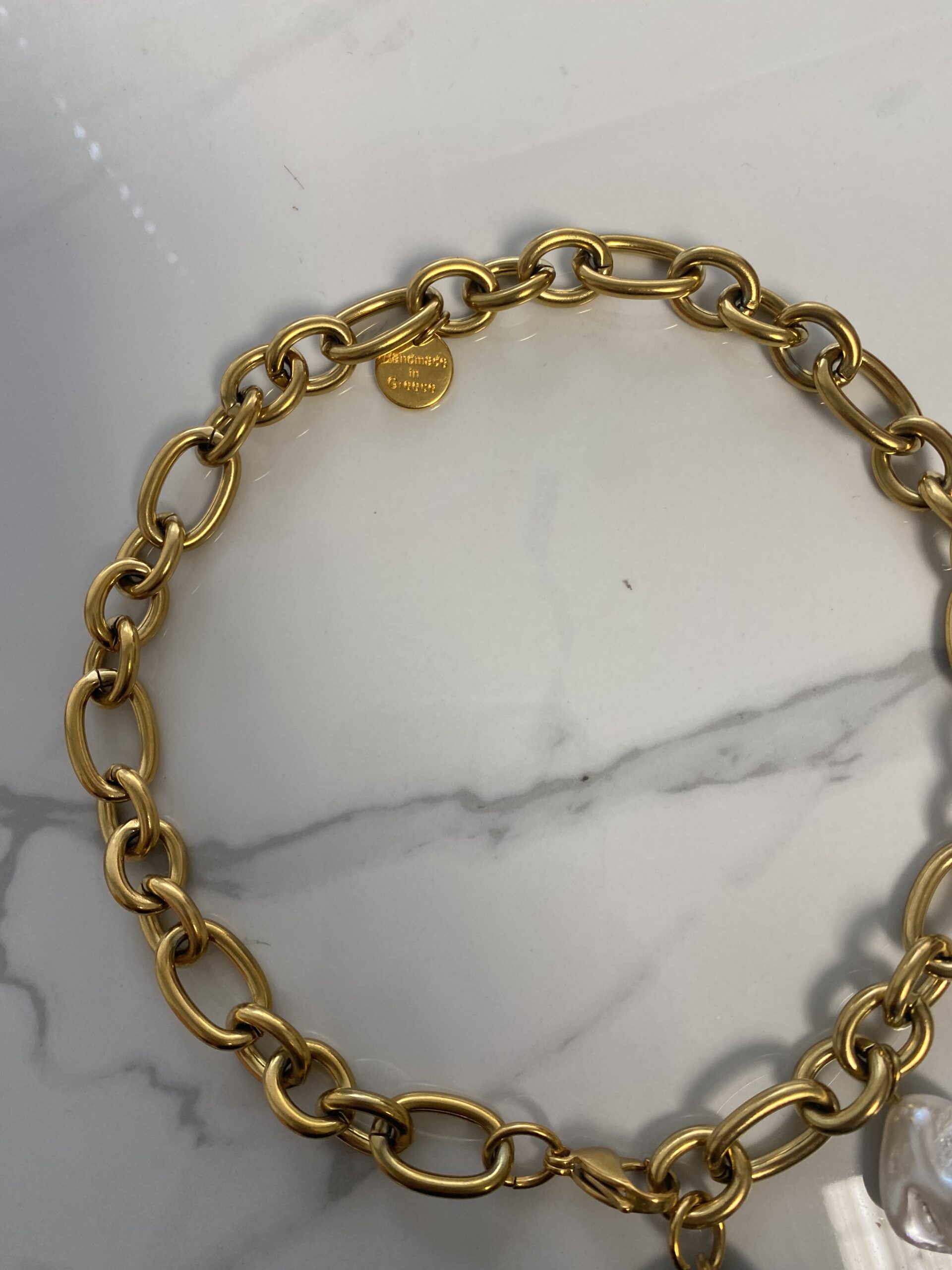 This is a beautiful statement necklace made of chunky heavy steel chain . chain has a thick bulky impressive finish . necklace closures at the front