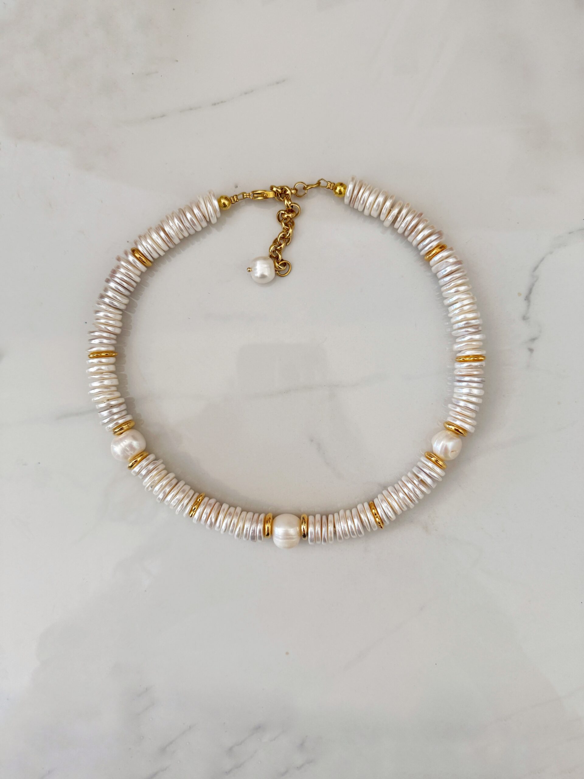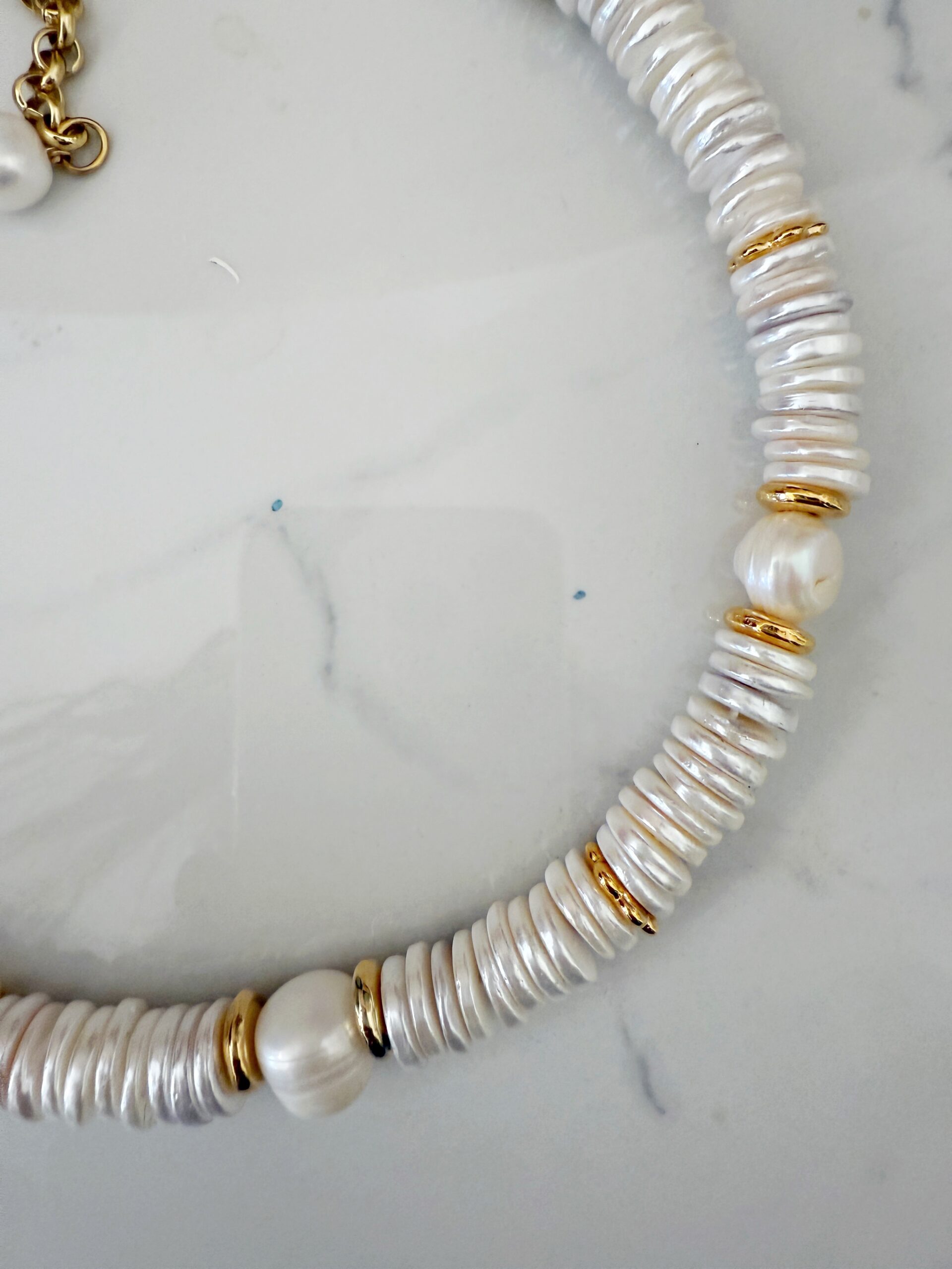 this is an impressive statement necklace. it is made of disc shaped beads made of the inside part of shells . these are not fresh pearls but still made of natural elements . these beads are known as “pearl shells ” .