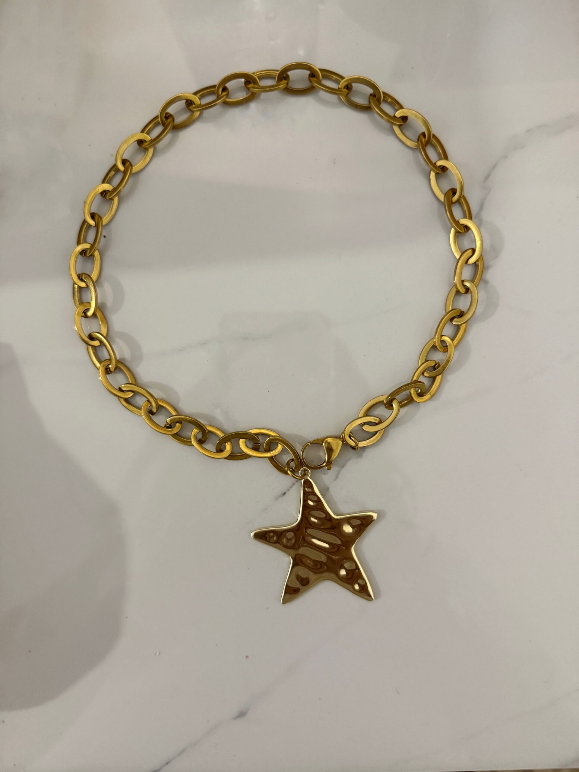 Short necklace made of chunky steel chain decorated with a large star pendant made of copper .