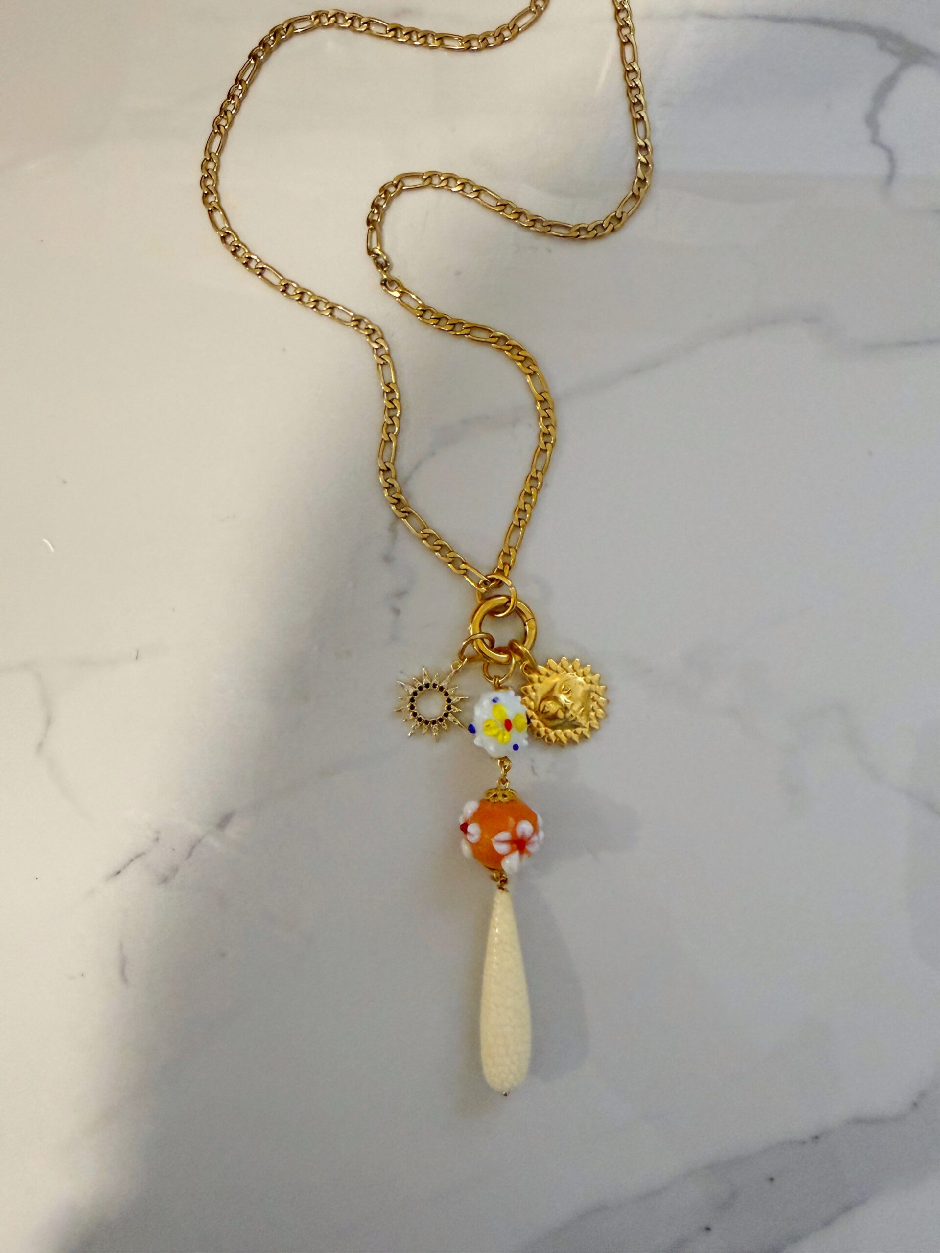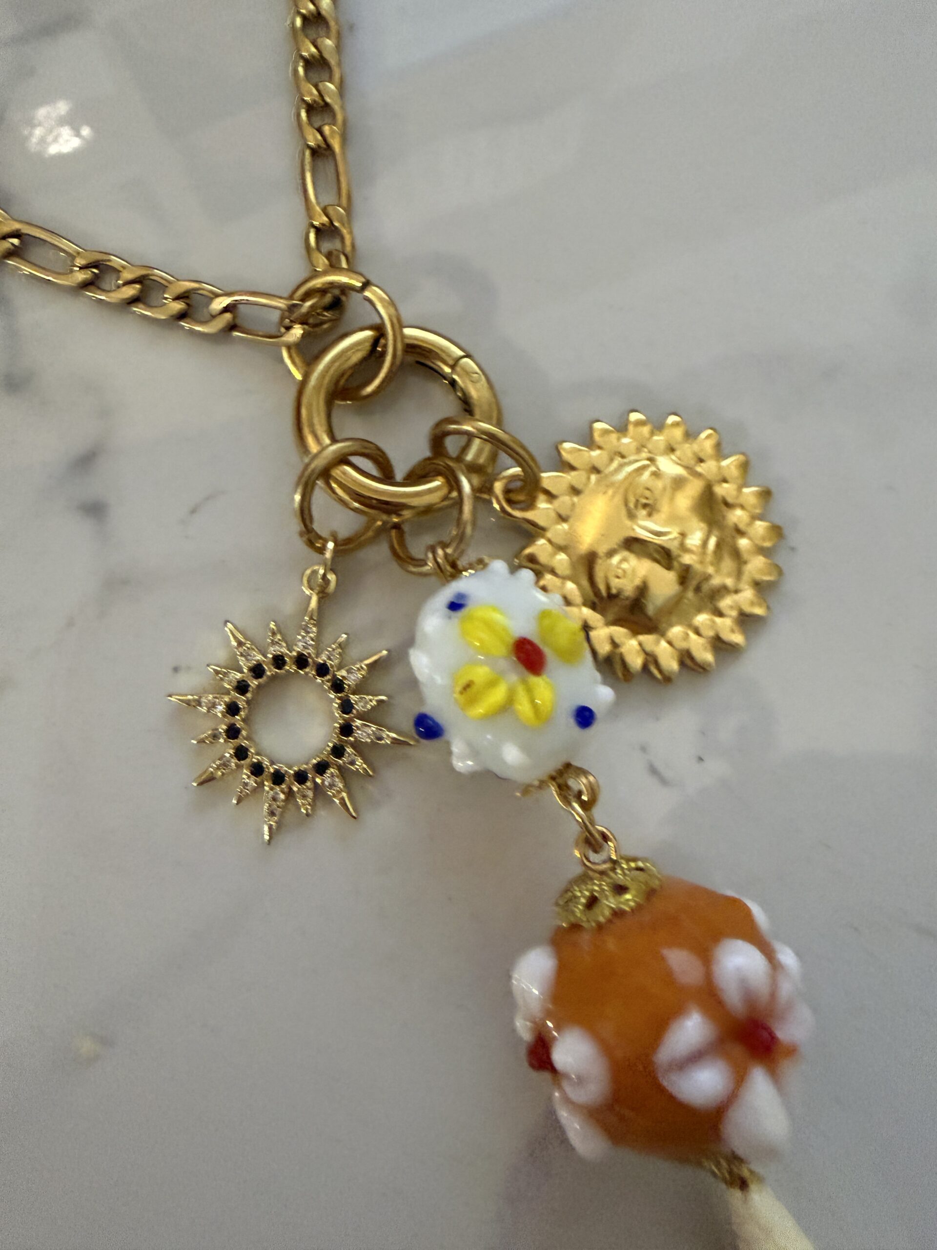 stainless steel classic Figaro chain . Decorated with ceramic beads, charms and gemstones .