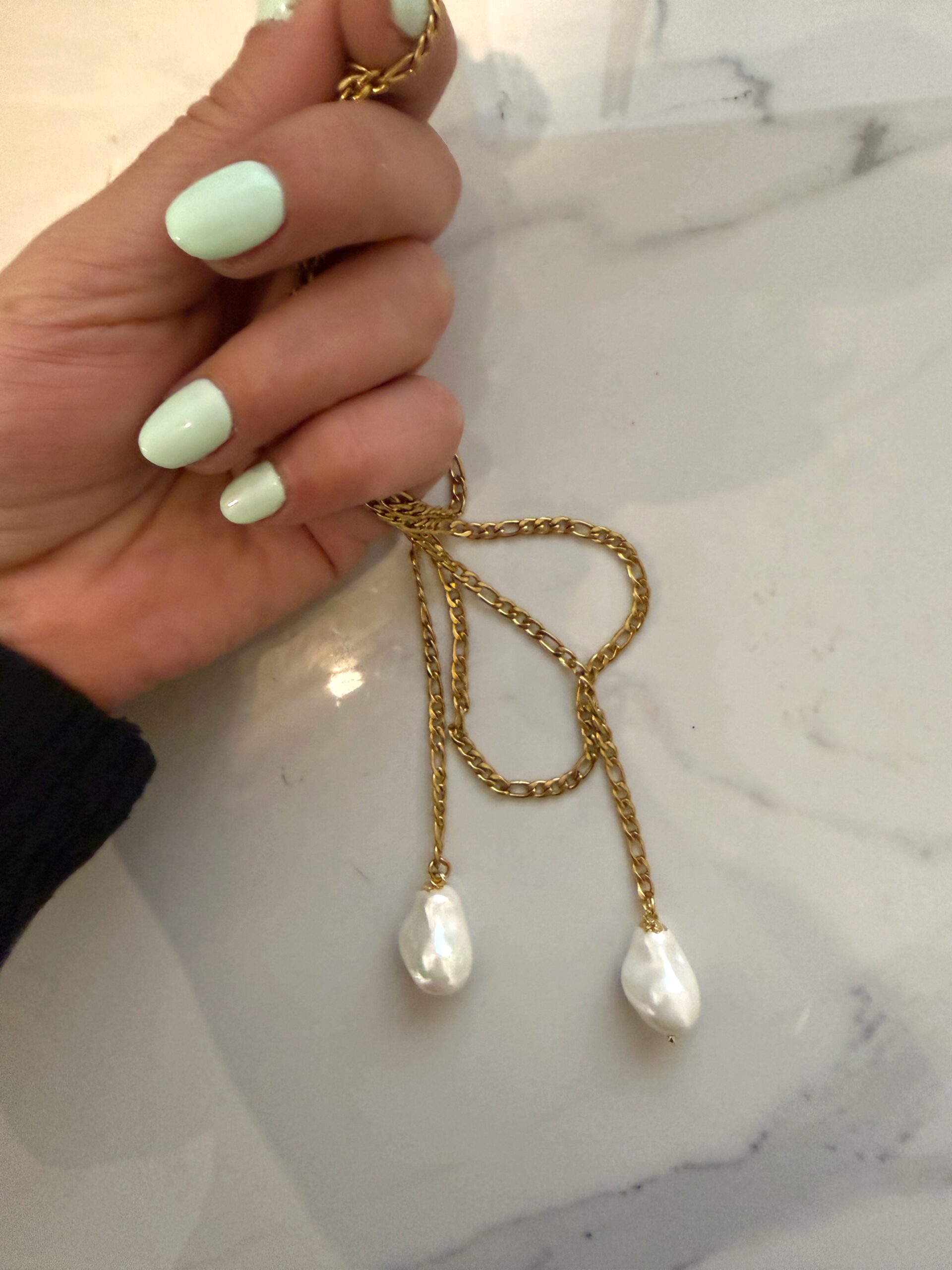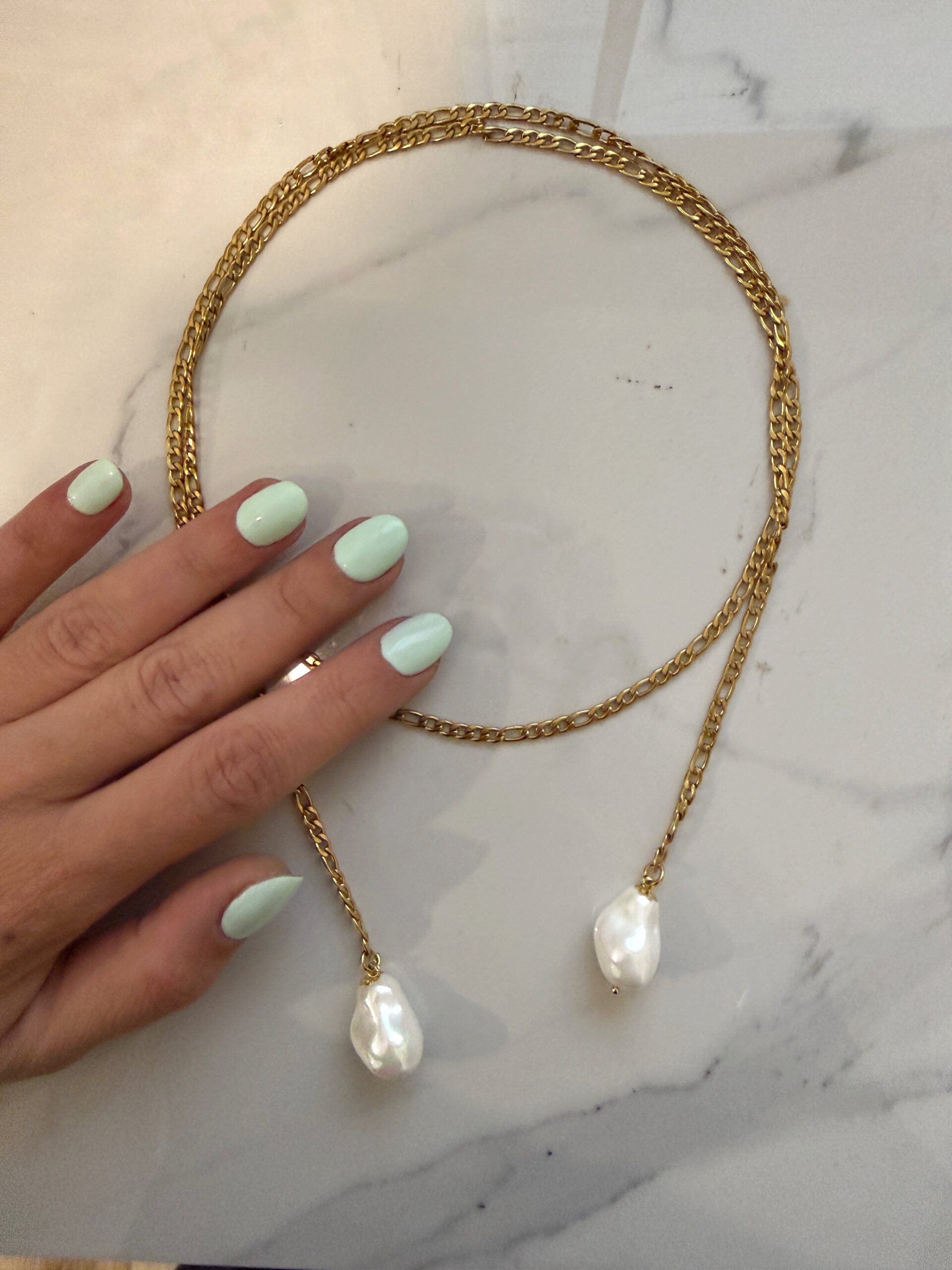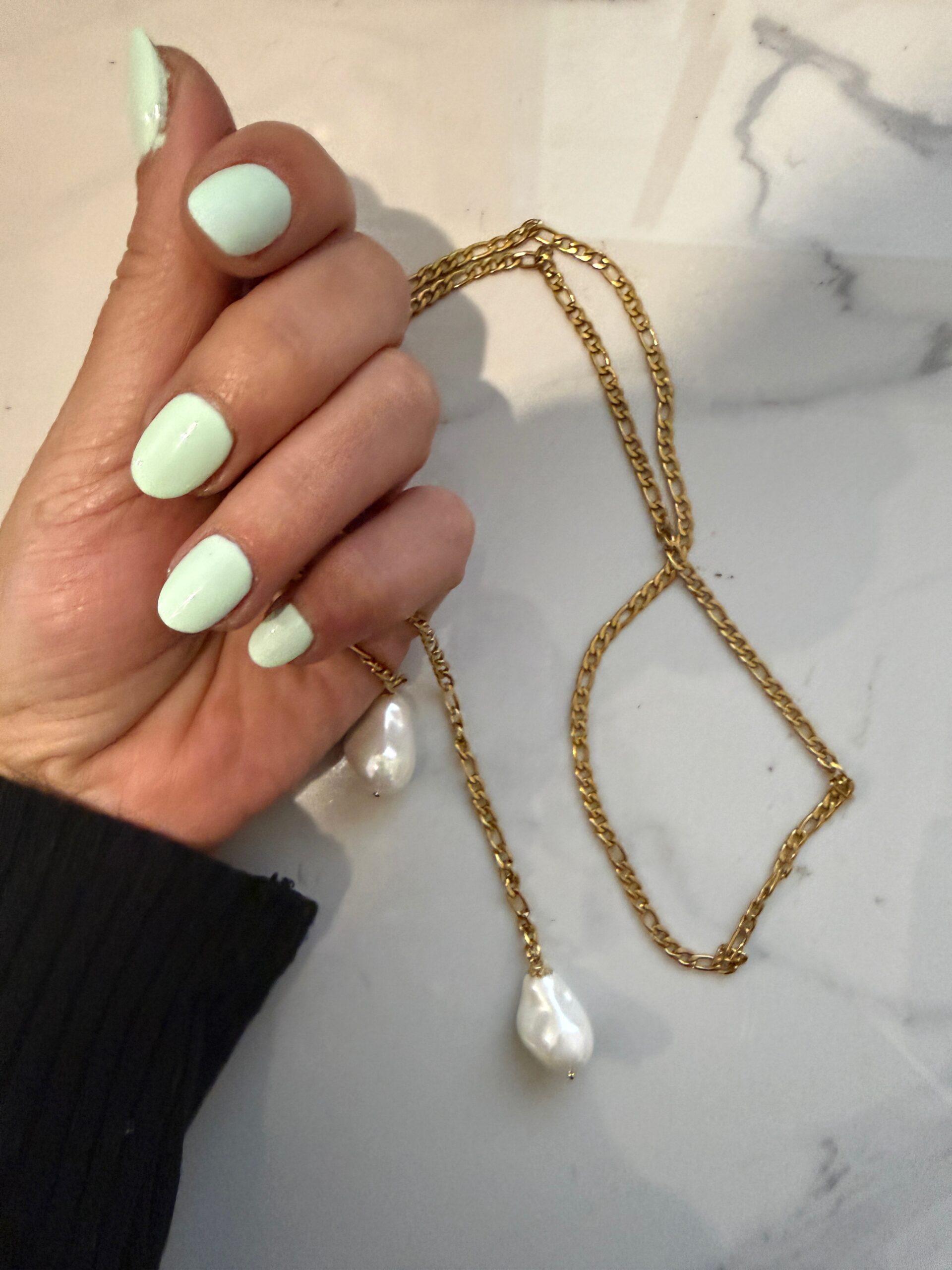 stainless steel Figaro chain 90 cm decorated with two charms made of mother of pearl .