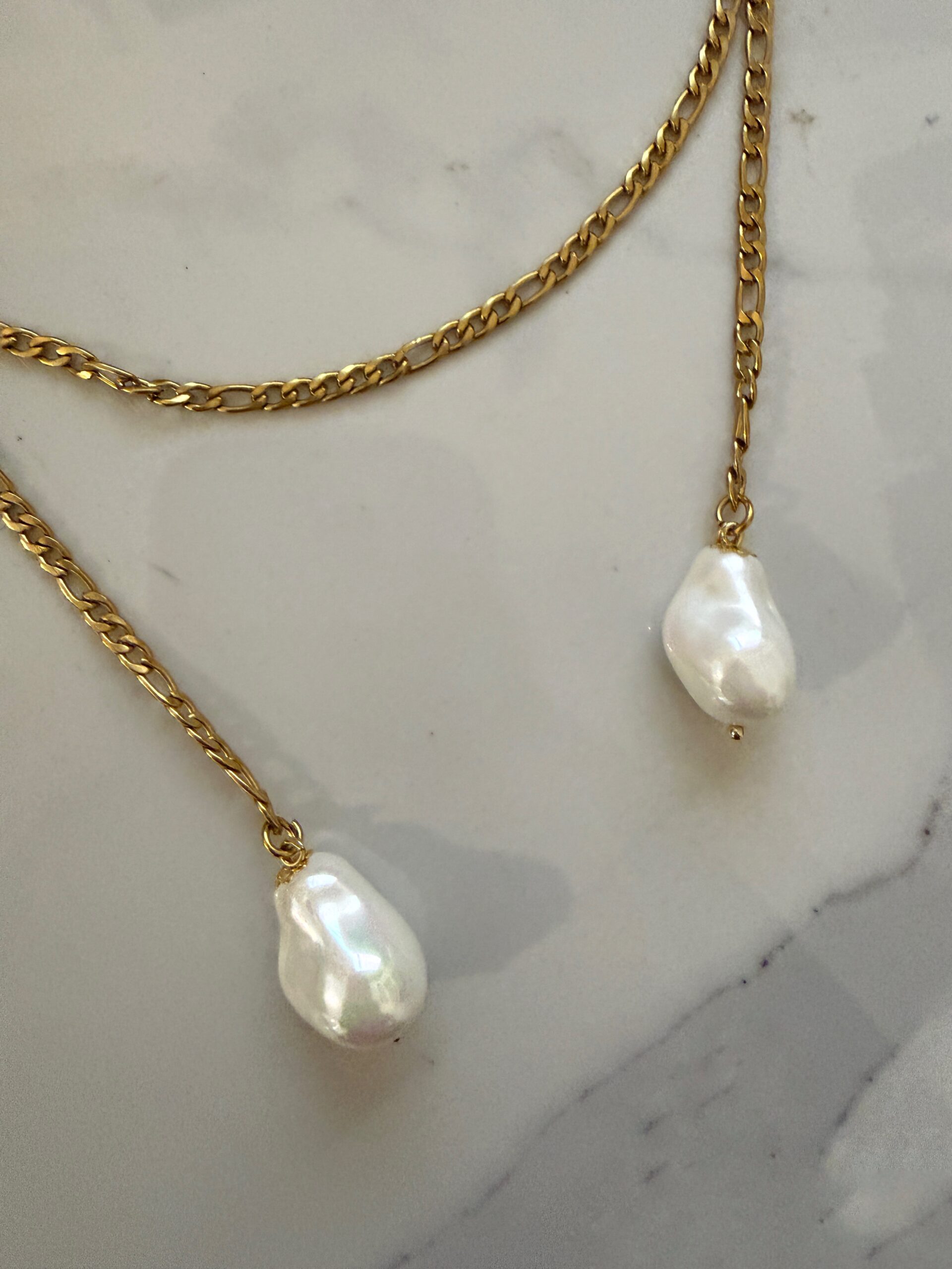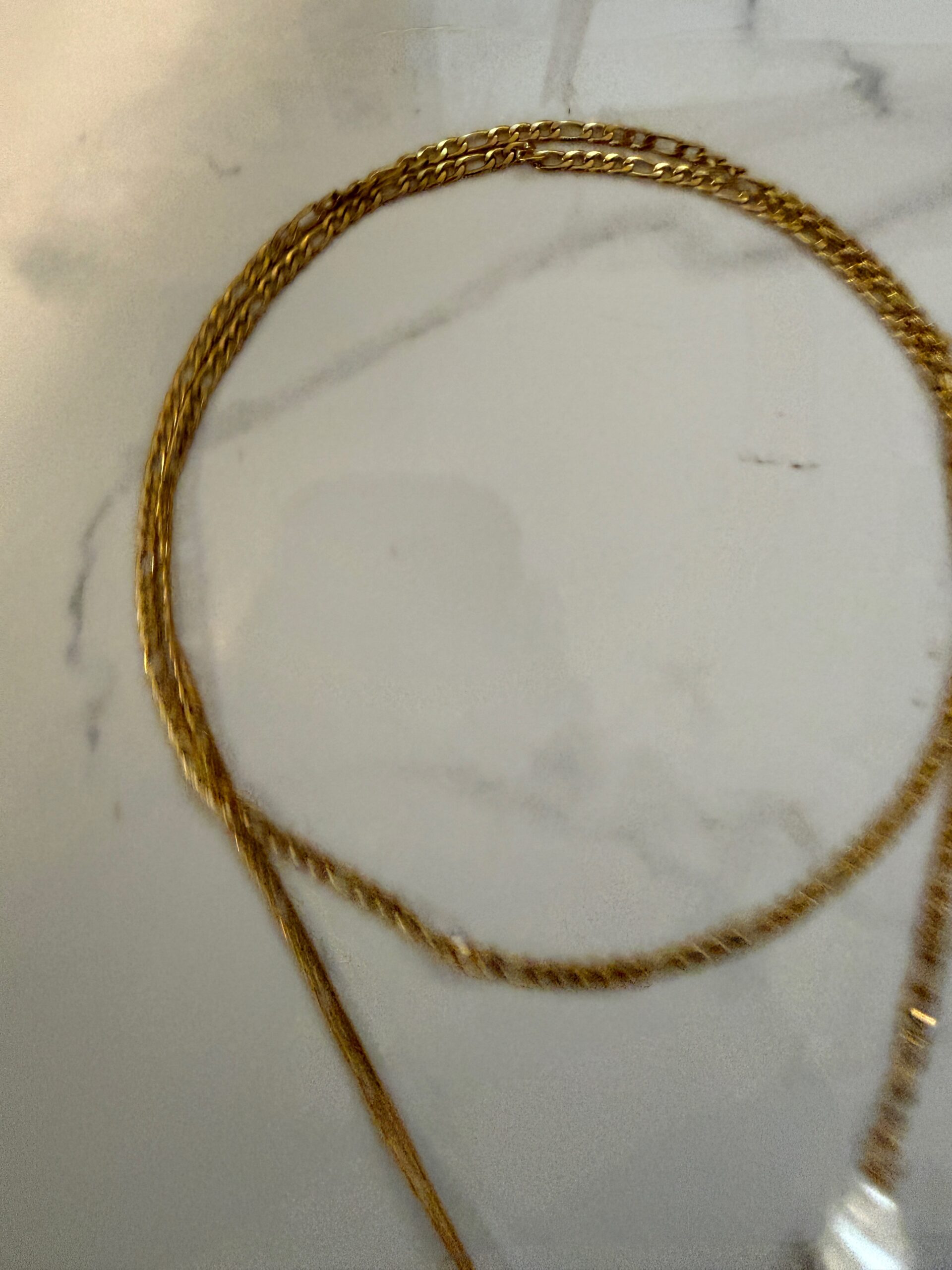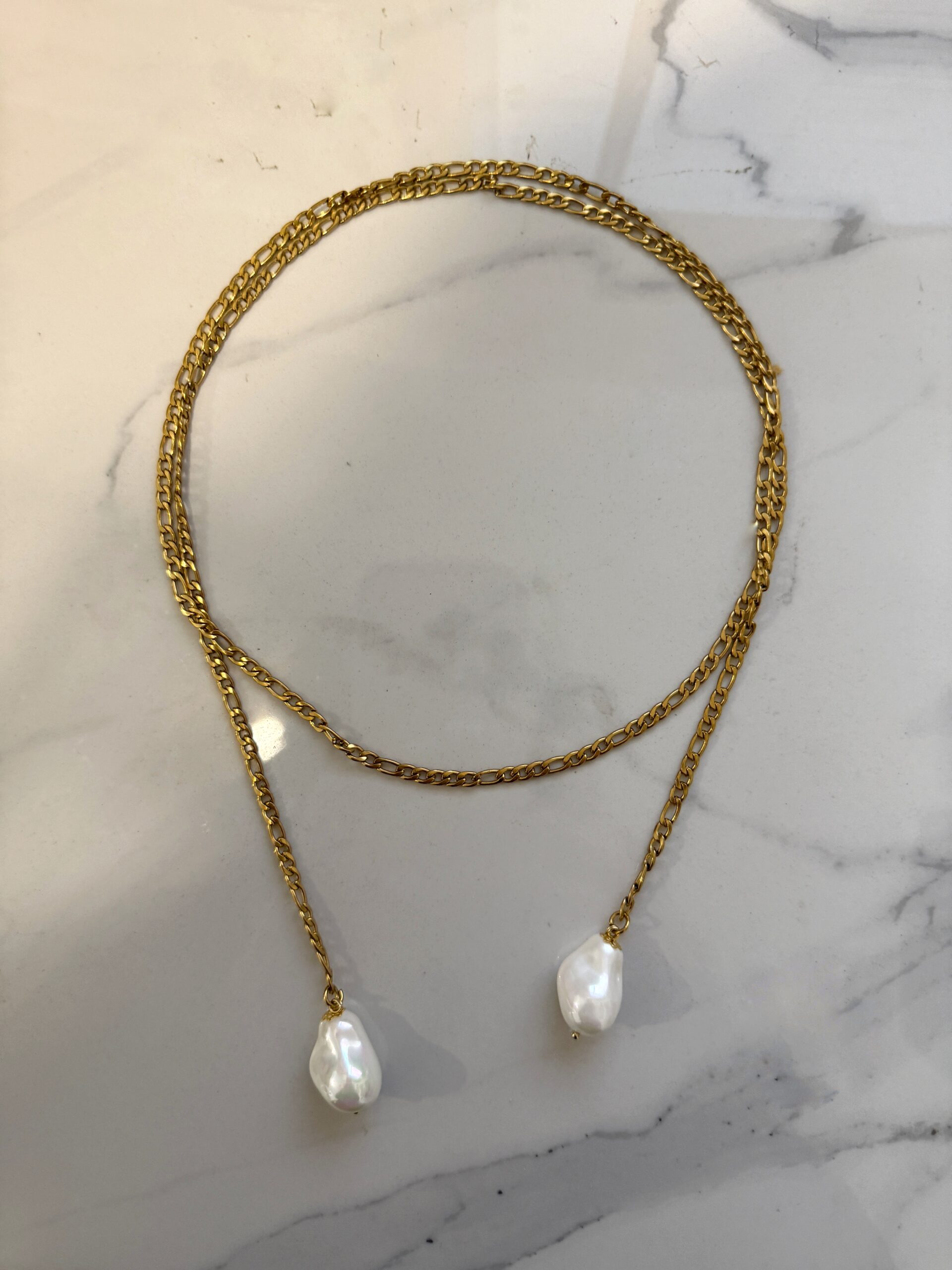 stainless steel Figaro chain 90 cm decorated with two charms made of mother of pearl .